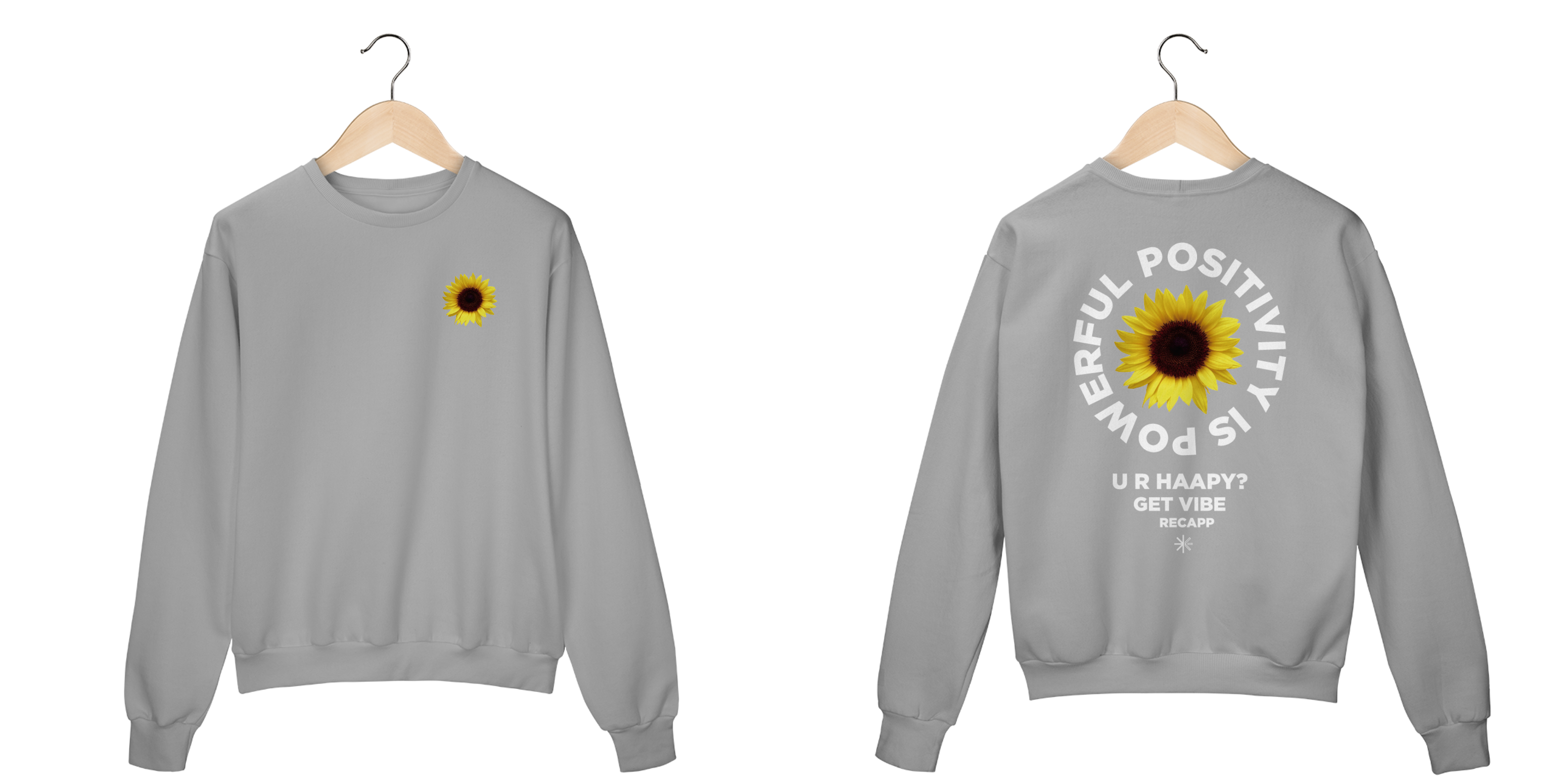 Recapp Get Vibes: Com um visual leve e vibrante, a Get Vibes traz o símbolo de felicidade e energia do girassol estampado na frente. Nas costas, a frase motivacional “Powerful Positivity is Power” e “U R Happy? Get Vibe” destaca a mensagem de otimismo. Confeccionada com materiais de qualidade, essa peça une estilo e conforto, sendo ideal para looks descontraídos e cheios de atitude.