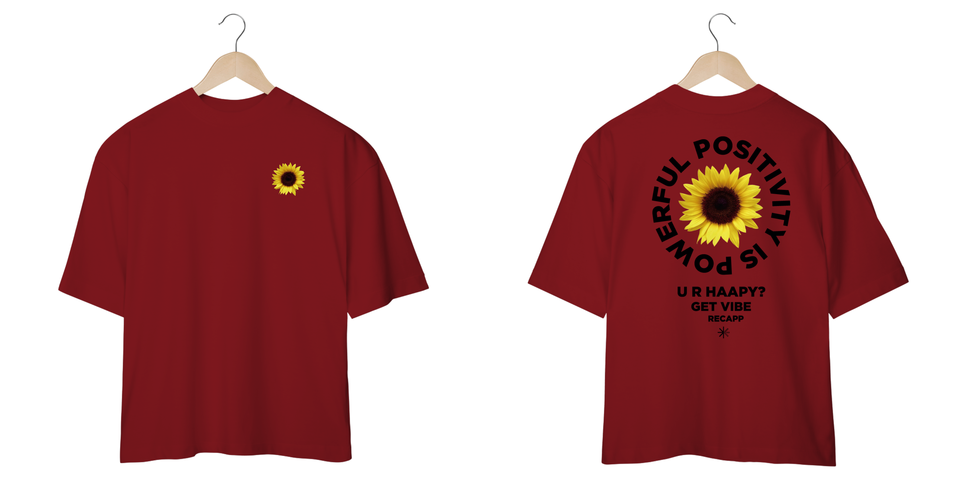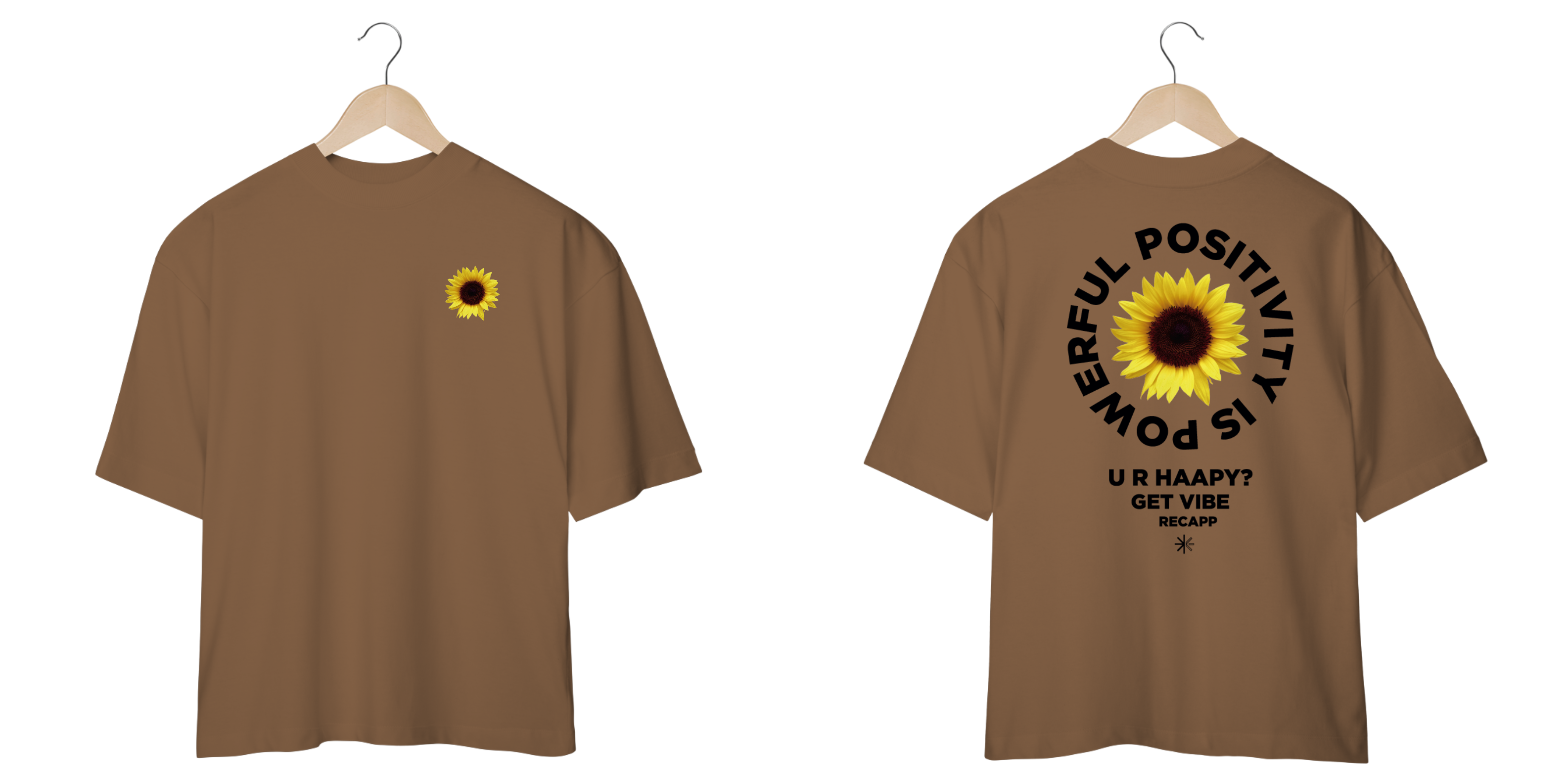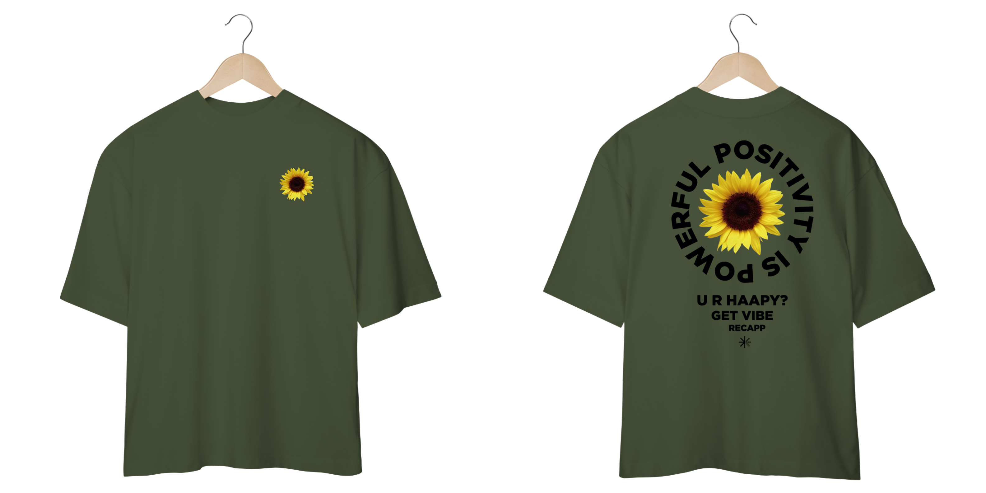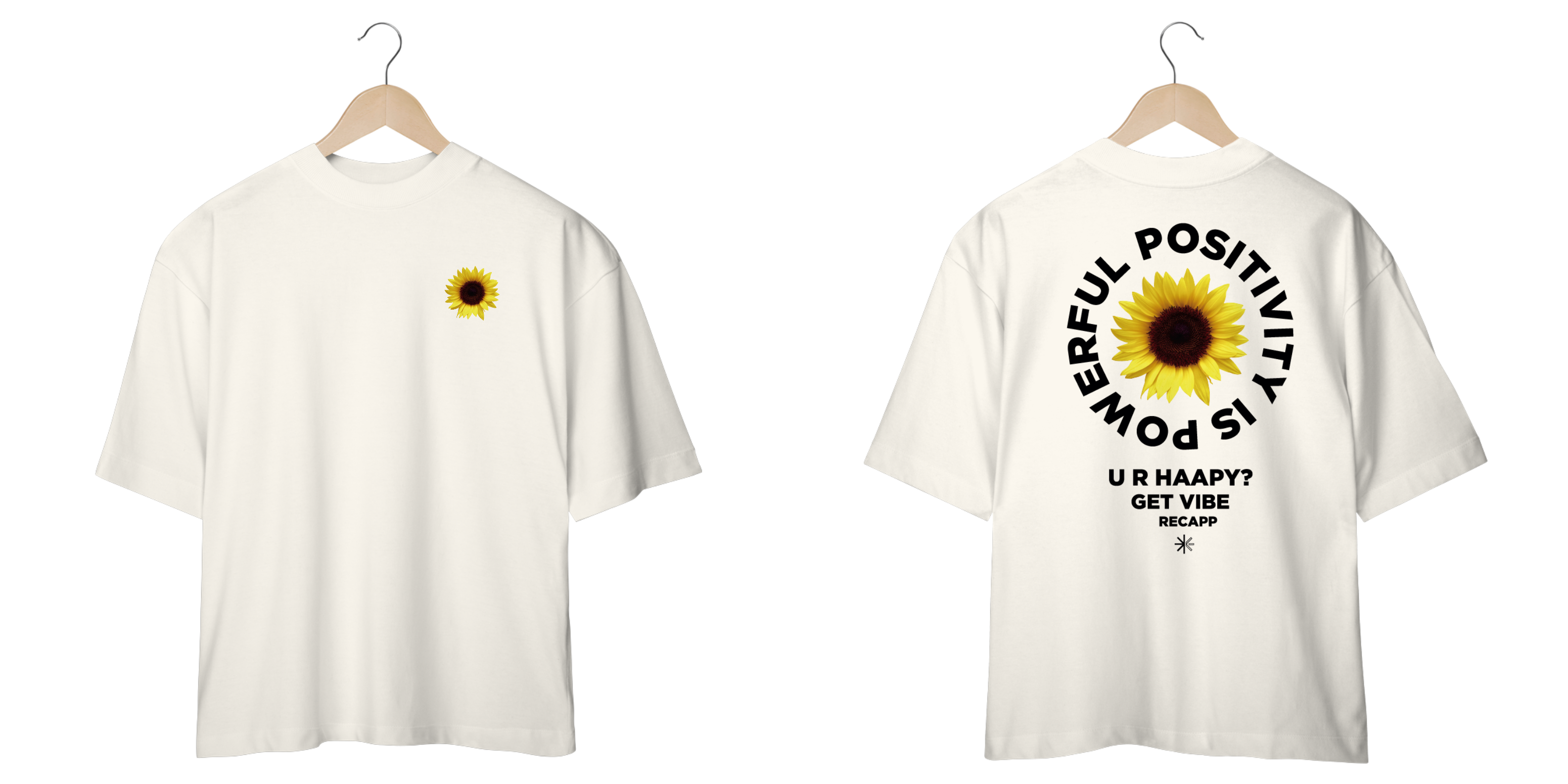 Recapp Get Vibes: Com um visual leve e vibrante, a oversized Recapp Get Vibes traz o símbolo de felicidade e energia do girassol estampado na frente. Nas costas, a frase motivacional “Powerful Positivity is Power” e “U R Happy? Get Vibe” destaca a mensagem de otimismo. Confeccionada com materiais de qualidade, essa peça une estilo e conforto, sendo ideal para looks descontraídos e cheios de atitude.